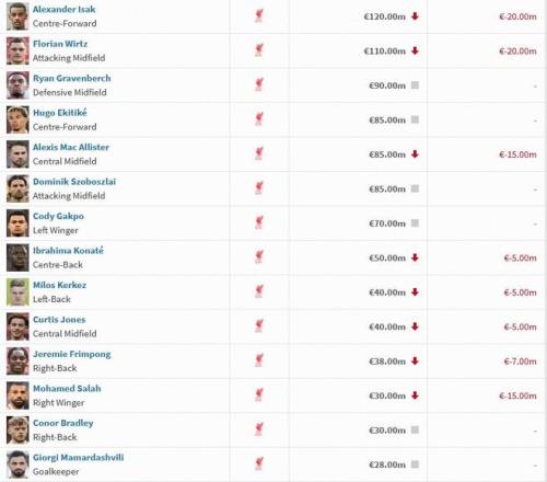 利物浦球員身價變動:伊薩克維爾茨下跌2000萬歐,薩拉赫下跌1500萬歐