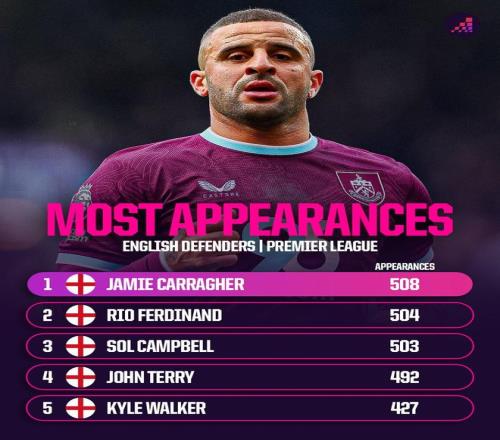 根據(jù)Opta Analyst的統(tǒng)計(jì),在伯恩利對陣埃弗頓的比賽中,沃克完成了個人第427次英超出場,超越索斯蓋特,成為英超歷史上出場次數(shù)第五多的英格蘭后衛(wèi)。