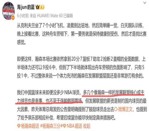 對此媒體人海jun的藍(lán)也發(fā)文談到了楊瀚森的情況,他表示:“我們中國籃球未來即便沒多少NBA球員,多幾個(gè)像瀚森一樣的發(fā)展聯(lián)盟核心或主力球員也是幸事,也不至于連輸韓國兩場。但發(fā)展聯(lián)盟的薪資是制約國內(nèi)球員的最大因素,昨天體育總局發(fā)的公告里明確提到了鼓勵(lì)球員走出去,也提到了給予俱樂部相應(yīng)補(bǔ)償,希望后續(xù)籃協(xié)能盡快制定具體措施吧。”
