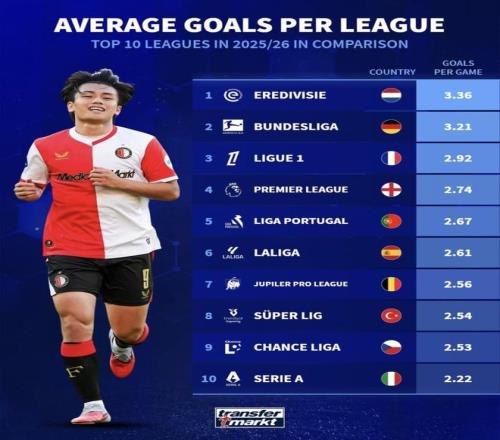 這份榜單最扎眼的地方,其實(shí)不是誰排第一,而是“誰被說好看、誰真的在進(jìn)球”。球迷口碑里,英超是公認(rèn)的“最好看聯(lián)賽”,結(jié)果場均進(jìn)球2.74,只排到第4,反而是存在感沒那么強(qiáng)的荷甲、德甲一個(gè)3.36、一個(gè)3.21,火力直接把英超和西甲甩開一截。更諷刺的是,法甲一向被嘲“無聊聯(lián)賽”,這次場均2.92擠進(jìn)前三——嘴上嫌棄、身體真香,數(shù)據(jù)說明大家平時(shí)罵得最狠的聯(lián)賽,有時(shí)候反而是進(jìn)球最多的那個(gè)。