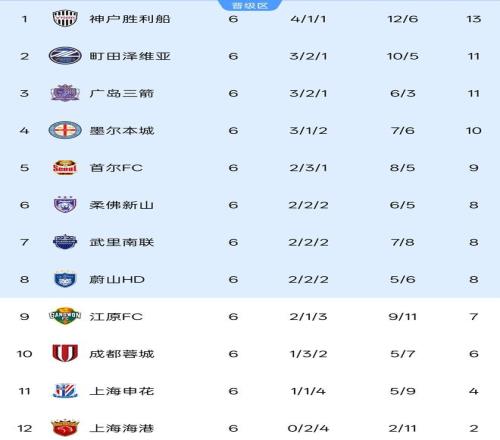 積分榜前列,4支球隊(duì)積分上雙,神戶勝利船積13分繼續(xù)領(lǐng)跑,町田澤維亞、廣島三箭同積11分分列第2和第3,墨爾本城積10分排在第4。4支球隊(duì)與淘汰區(qū)的分差都在3分及以上,基本已經(jīng)鎖定了晉級(jí)名額。
